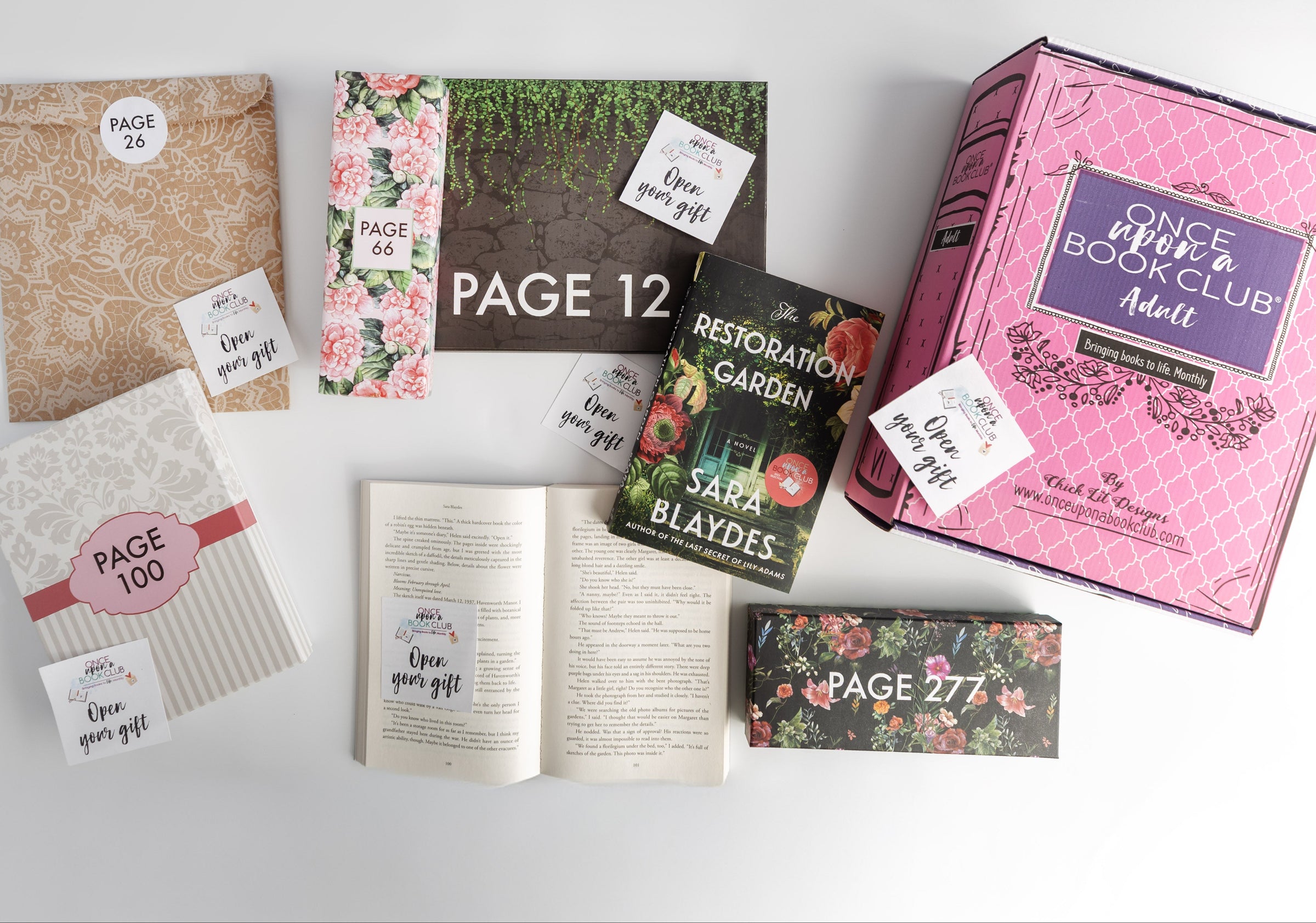 Welcome to Once Upon a Book Club, a monthly subscription box that includes wrapped gifts labeled with page numbers. No peeking! Only open your gifts as you read to experience a book that is brought to life before your eyes with items pulled directly from the descriptions in the story and placed right in your hands!