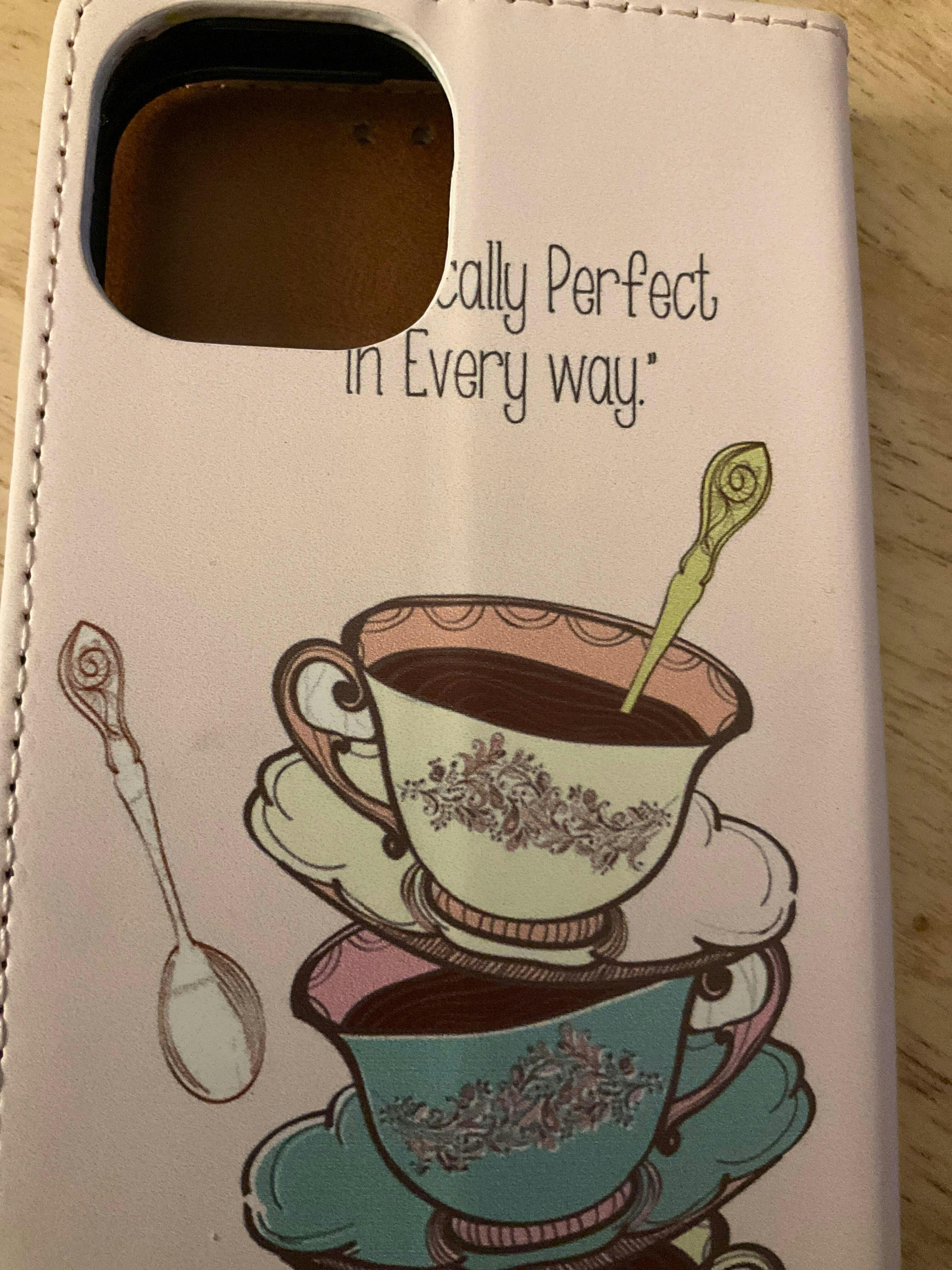 Experience our exclusively designed phone case inspired by Mary Poppins by P. L. Travers. This adorable phone case features a floral design on the front cover with the silhouette of Mary Poppins flying with her umbrella and bag over the London skyline. The back of the phone case features a stack of tea cups and the quote, "Practically perfect in every way."