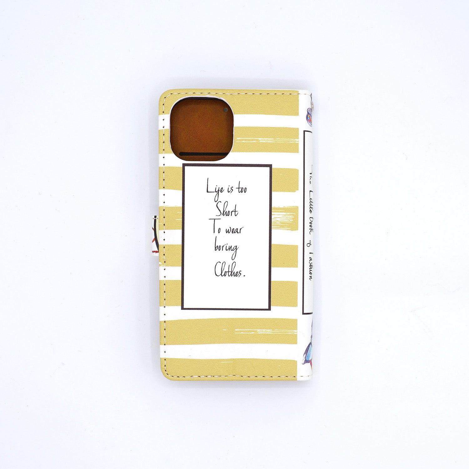 Experience our exclusively designed phone case inspired by The Little Book of Fashion. This beautiful case is inspired by a love of clothing and style. The front cover is designed with sketches of various articles of clothing. The back of the case is yellow and white striped featuring the quote, "Life is too short to wear boring clothes."