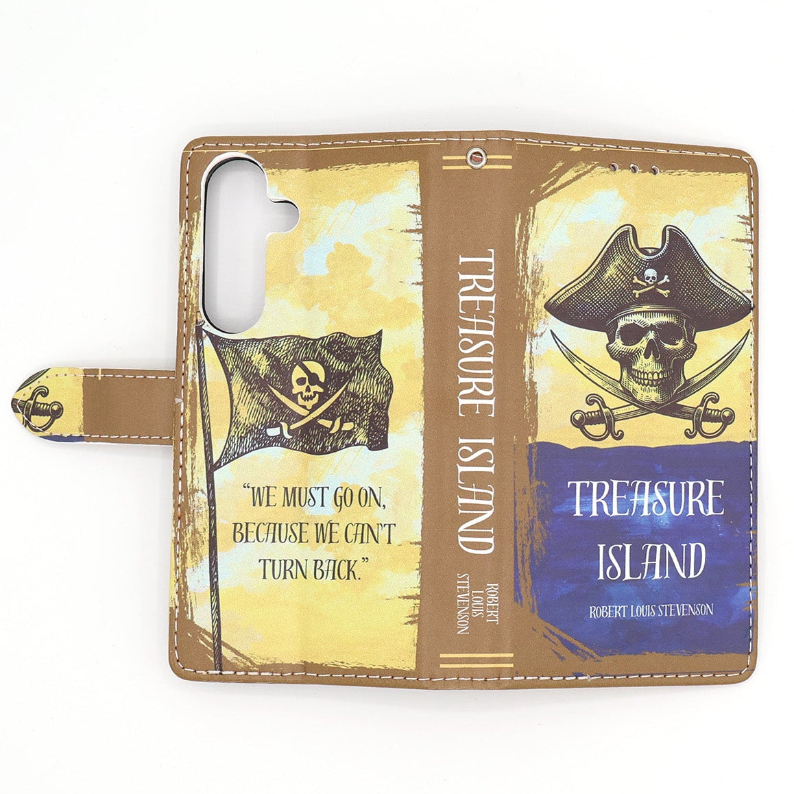 Experience our exclusively designed phone case inspired by Treasure Island by Robert Louis Stevenson. The front of the case features the traditional skull and swords wearing a pirate hat. The back of the case features a pirate jolly roger and the quote "We must go on, because we can't turn back."