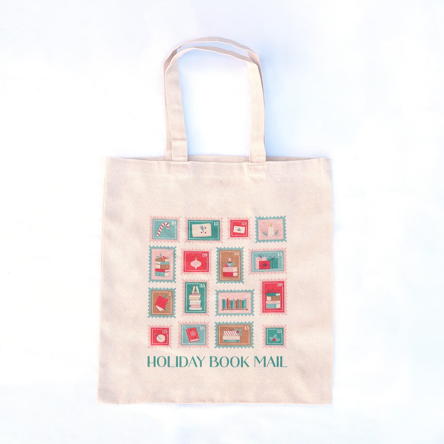 Tote bag with 'Holiday Book Mail' design featuring postage stamp-like graphics on a light background